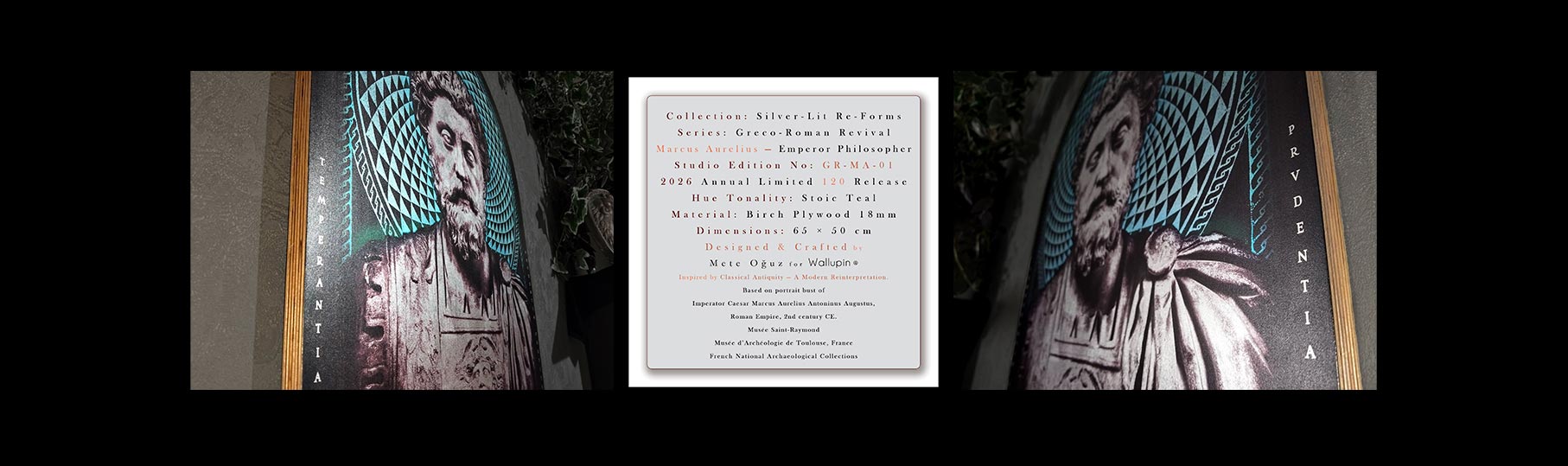 Inspired by antiquity yet conceived for modern spaces, these works function as sculptural wall objects rather than traditional prints. Their presence changes with light, distance, and angle, creating a dynamic viewing experience that rewards prolonged observation.